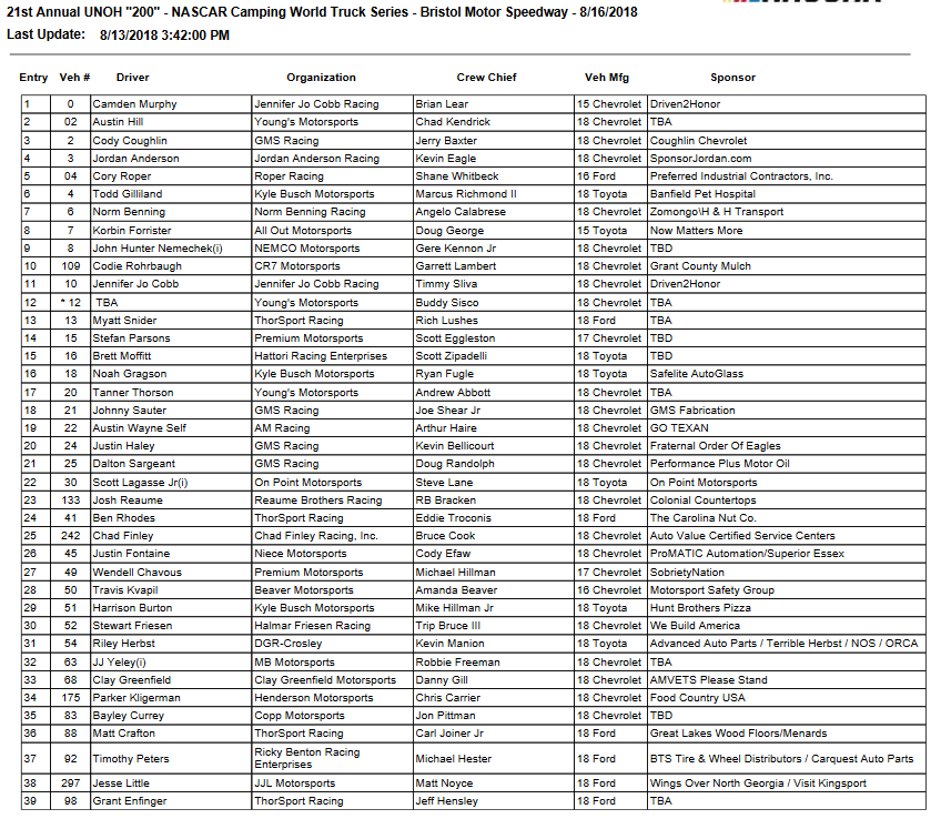 It's a shame for Murphy that he is with Jennifer Jo's team, I think he has some talent but he is never going to show it starting and parking for her.#12 has already withdrawn, 27 trucks are locked in on owner's points.