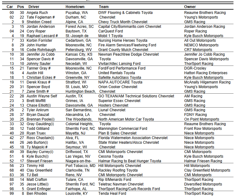 I think that's listed by truck number with the starting spots next to it. Eckes and Ankrum are the front row not Ruch and Fogleman.Some of the faster trucks are going to have to wade thru a whole slew of them to get up to the front