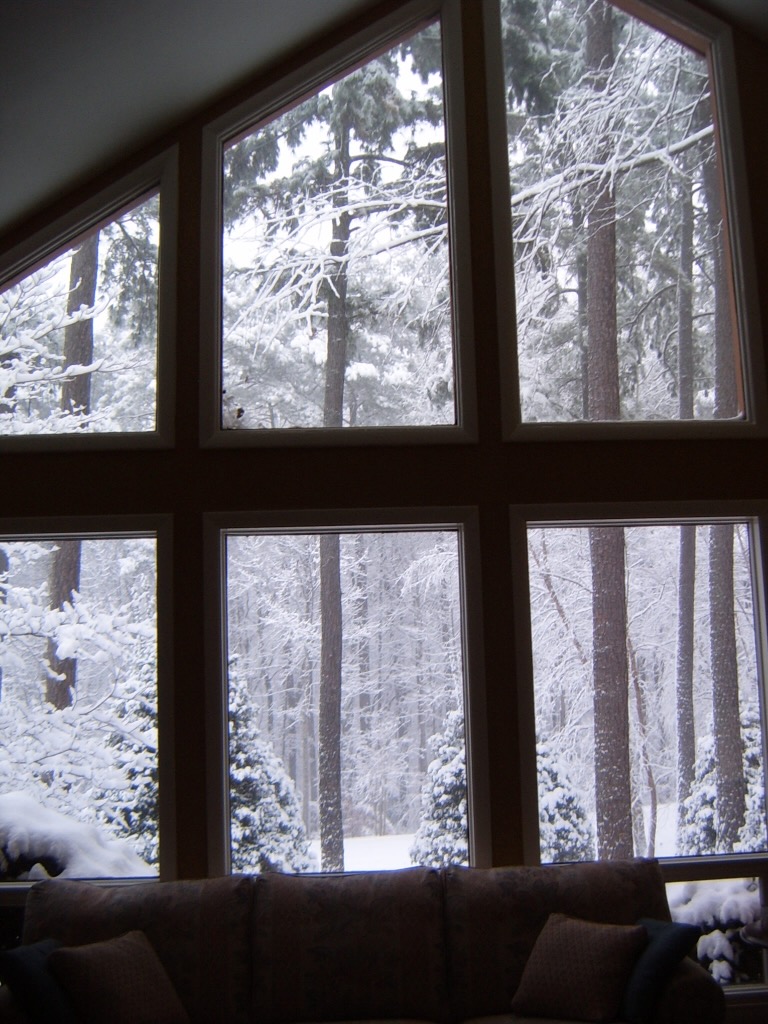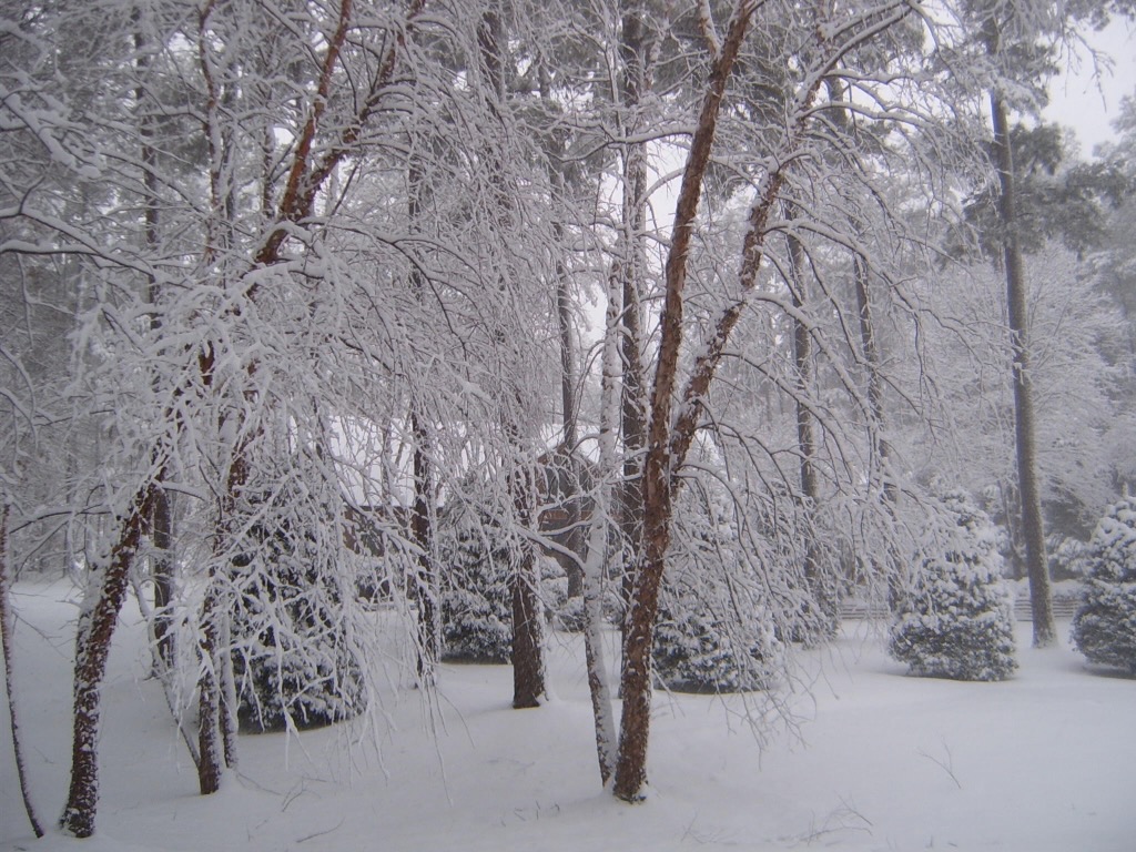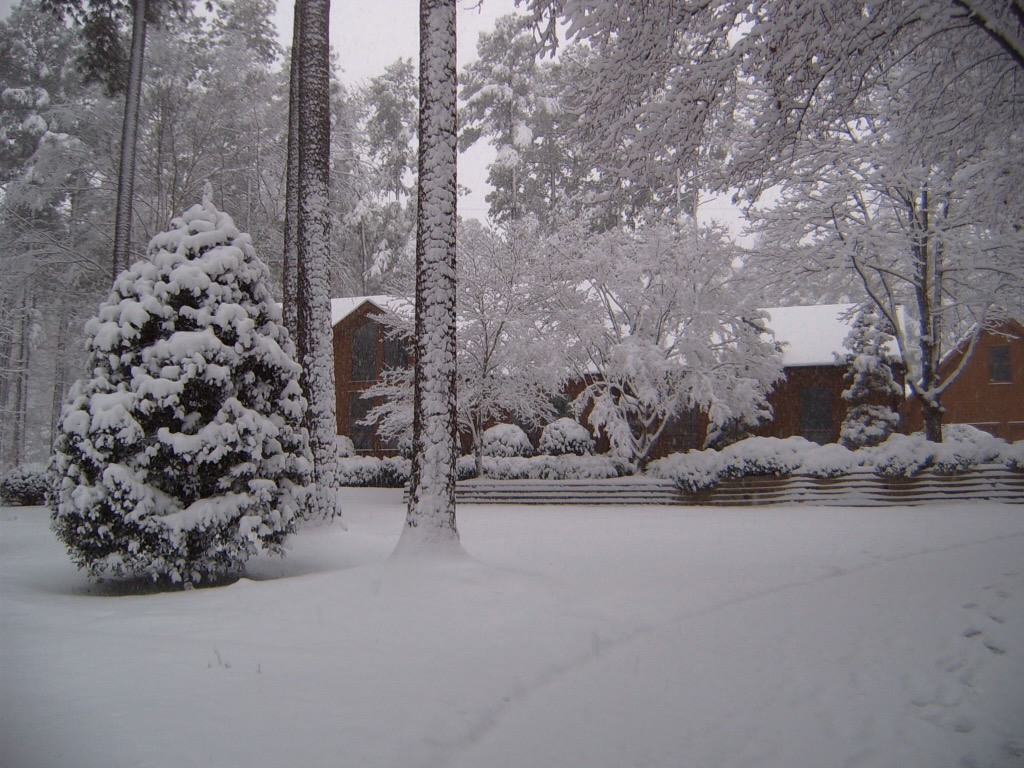 A couple of inches of snow at our home in Raleigh. Note the trees are mostly covered in ice. That year the ice on top of the snow brought things to a standstill for a few days. Few things are more picturesque than a layer of fresh snow