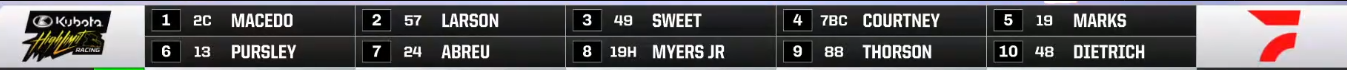 Great racing. Thorson takes the lead from Reutzel and then overdrives it trying to hold off Courtney and spins out, doing a full 360 under green.