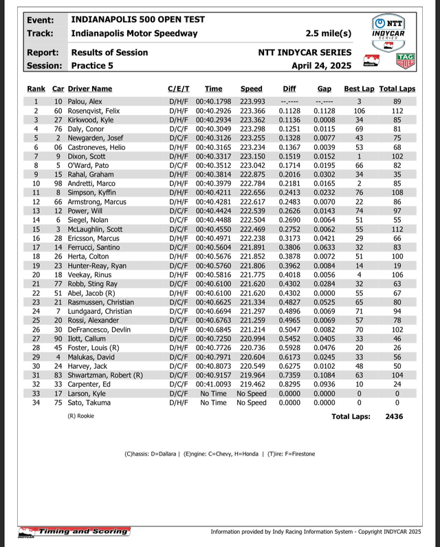 Palou looked awfully dangerous across both days, both with and without traffic. Kind of a ‘no ****’ statement, but the only thing missing from his résumé is an oval win after all. He came as close as it gets in 2021, and very possibly wins in 2023 without the pit incident with VeeKay. He’s gonna be a problem next month.