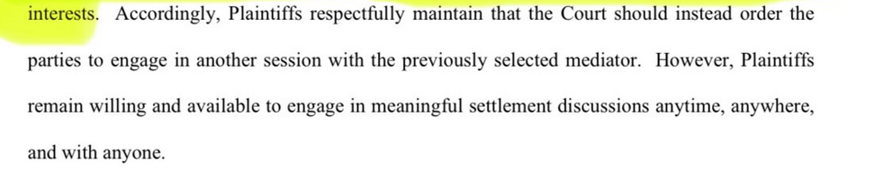 Accordingly, Plaintiffs respectfully maintain that the court should order the parties to engage in another session with the previously selected mediator. However, Plaintiffs remain willing and available to engage in meaningful settlement discussions anytime, anywhere, and with anyone.