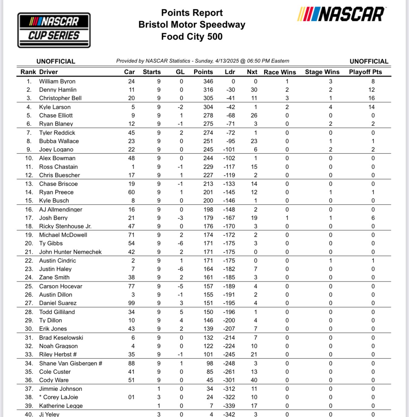 Dang, Larson better step up his game. After what I thought was a good performance at Bristol he still loses 2 in the G/L column. Kind of comical (maybe more like sad) that NASCAR can't get this right.