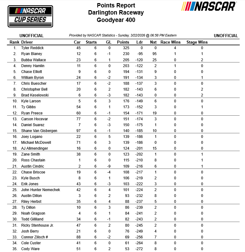 So far I think it has changed the complexion of the races from what I see. There is a whole lot less bumper cars going on.Hey, NASCAR, see what happens when you give race winners sufficient points? Dominant drivers can get some separation. And with a minmal reset, they have every reason to try to stay there.
