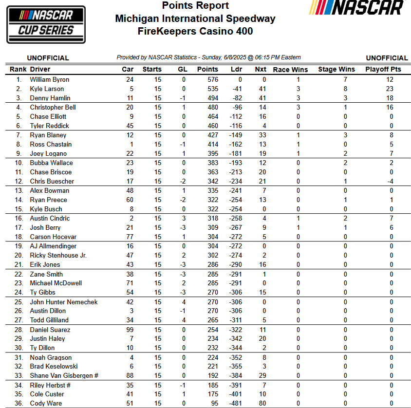 Byron's consistency is admirable. We'll see if that translates into playoff success.This is what’s wrong with the point system. 3 drivers have 3 wins. The guy with 1 win leads the points.