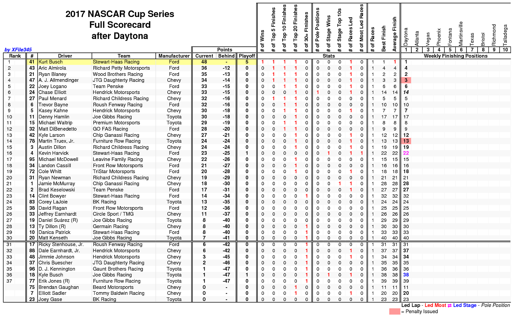 So, looking at those standings, it's basically a way of saying even though Harvick finished 22nd, he had mostly a top 5 car today. I like it. A great way to measure performance.