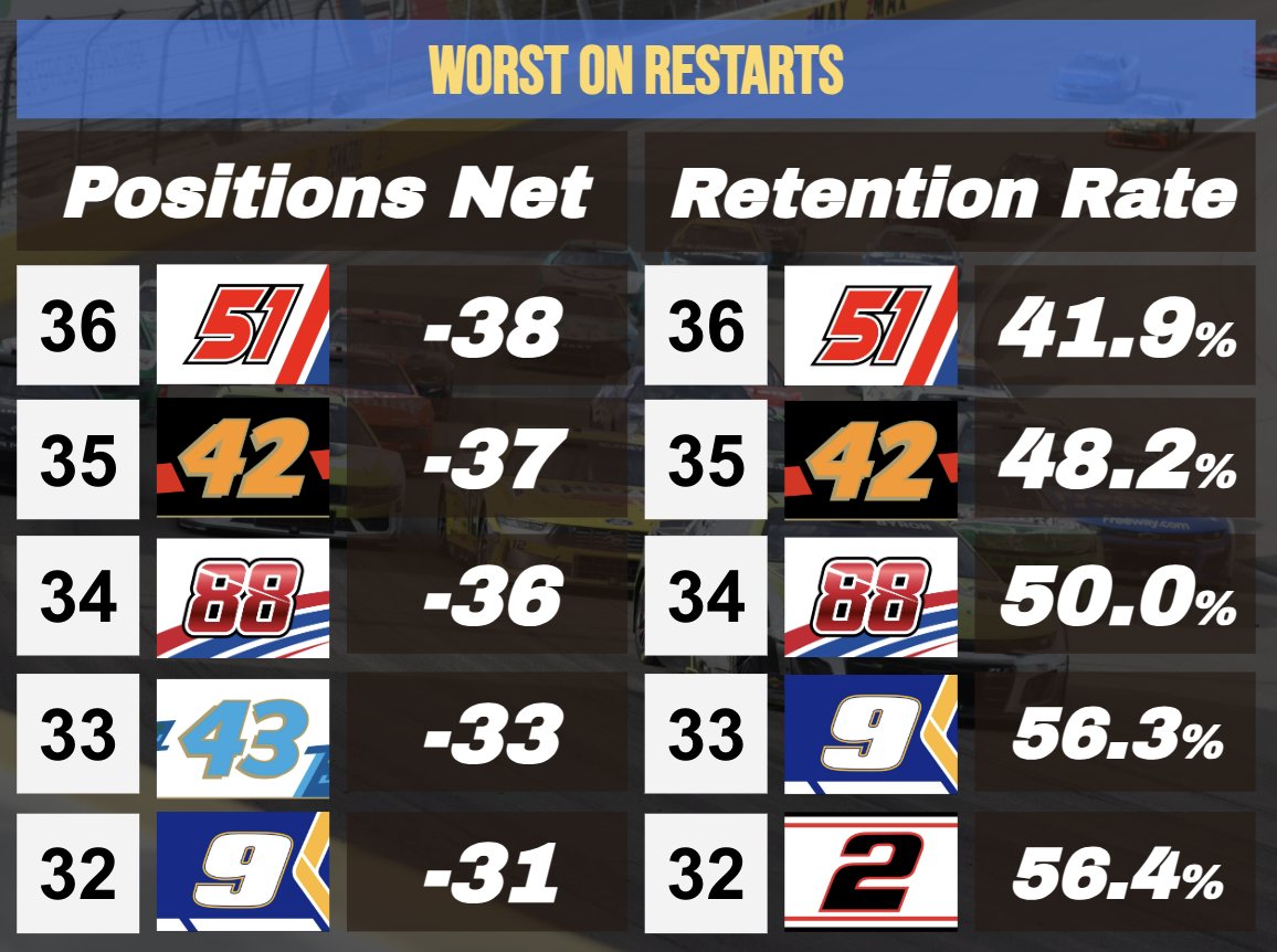 When you are losing spots on restarts and you are ranked along with Eric Jones, Nemechek, SVG and Cody Ware as the biggest losers, blaming it on everything and not including the driver in the mix also is nonsense or shall we say selective memory lapses? Pretty sure losing all of those spots would leave any team scrambling. Of course "reasonable" isn't a word I would use for rabid Elliott fans.