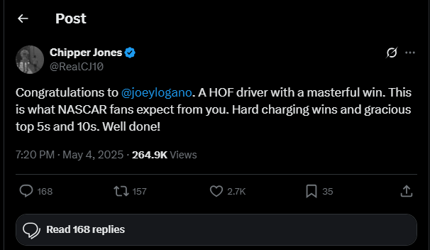 I think its safe to say Chipper gets sauced while hes watching the races and then goes to the twitter machine to give us his expert analysis.Chipper praised him.