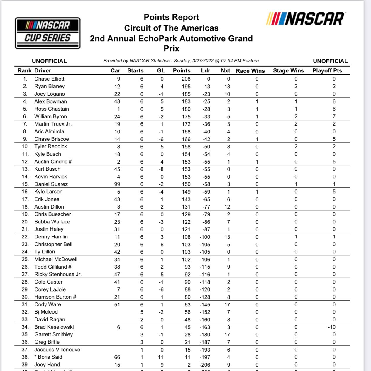 I’m going off this https://www.espn.com/racing/standings which has Bowman as the leader in points.Actually if the playoffs started today, Chase would get the 15 playoff points awarded to the season points leader. Bowman would get 7 points for 4th place, so added to his current 6 points he would have a total of 13 playoff points. So the overall points standings do have some value and importance.