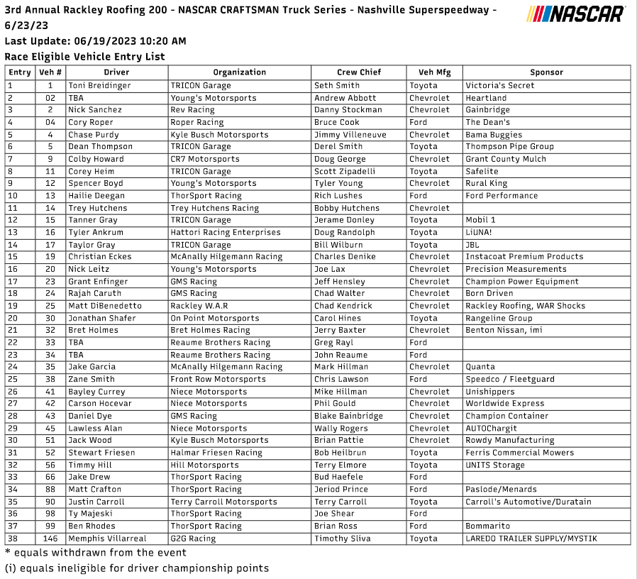 Love that Bobby Issac avatarThe Entry List for the Rackley Roofing 200 NASCAR CRAFTSMAN Truck Series race at Nashville Superspeedway on Saturday has been released. There are 38 drivers/teams for 36 spots. Since 38 teams are entered, two will miss the race. Some notes: 04-Roper, 14-Huchens, 20-Leitz, 30-Shafer, 66-Drew, 90-Carroll.