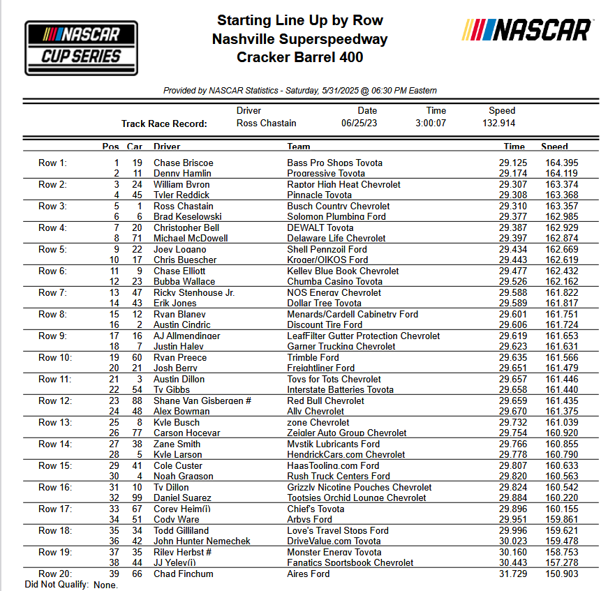 Nashville Superspeedway (1.333-mile oval) – Lebanon, Tenn.