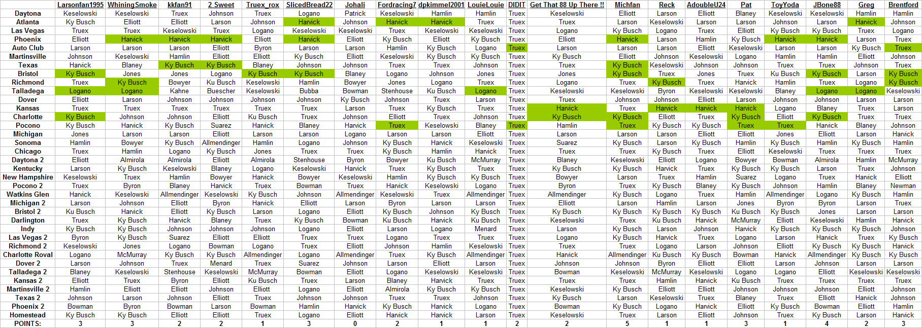 Congrats to @Get That 88 Up There !! @Michfan @Pat @JBone88 and myself for picking Kyle Busch to win the Coca Cola 600. Jbone88 and Michfan are atop the points with 4 each. Only @Johali is left with zero.