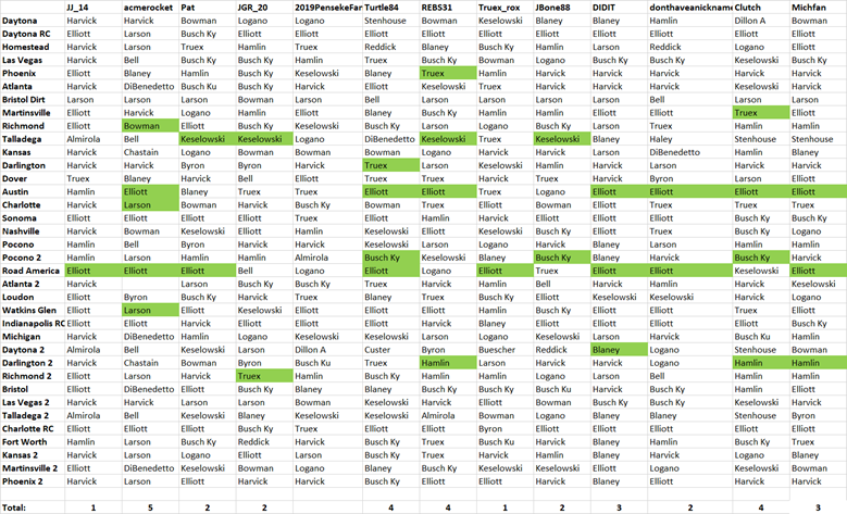 I'll try to post standings today or tomorrow.Doesn't look like anyone picked Larson for Bristol, but quite a few of you all picked Hamlin for Richmond. Not sure where that leaves everyone in the standings.