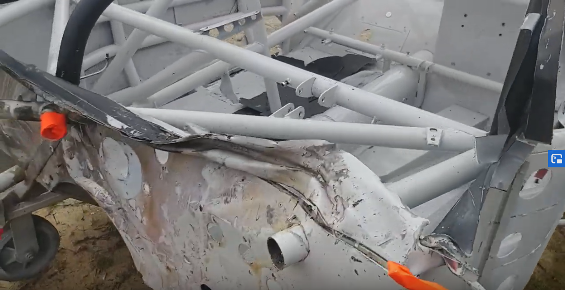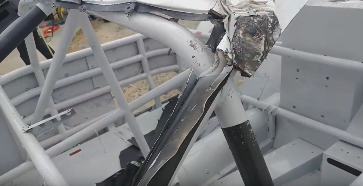 They tried to get pictures of Newman's chassis but the camera squeezed its lens shut really tight and made whimpering noises.Capt Ron showing the impact points on Corey's chassis where Ryan's car hit
