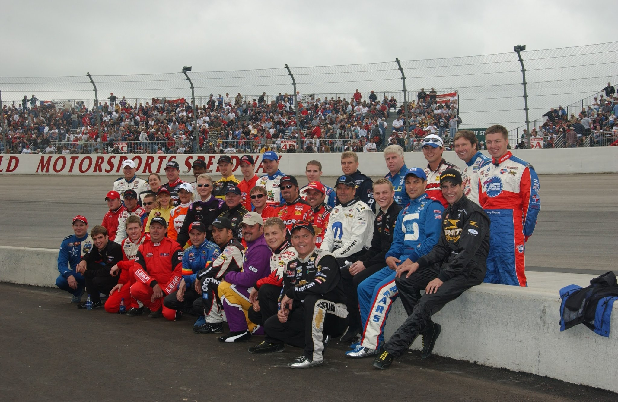 Beautiful!The drivers of the first Truck race at Mansfield. How many do you recognize? Young Carl on the front row and Kez on the back row