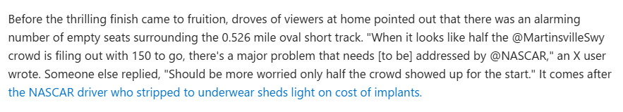 Sorry to vent about something unrelated. Hey, I'm going to a NASCAR race this year (almost certainly) and there's lots of seats available right now. I'm planning on getting them as a casino comp from the presenting sponsor because, well, it ain't remotely sold out and they seem to like me.