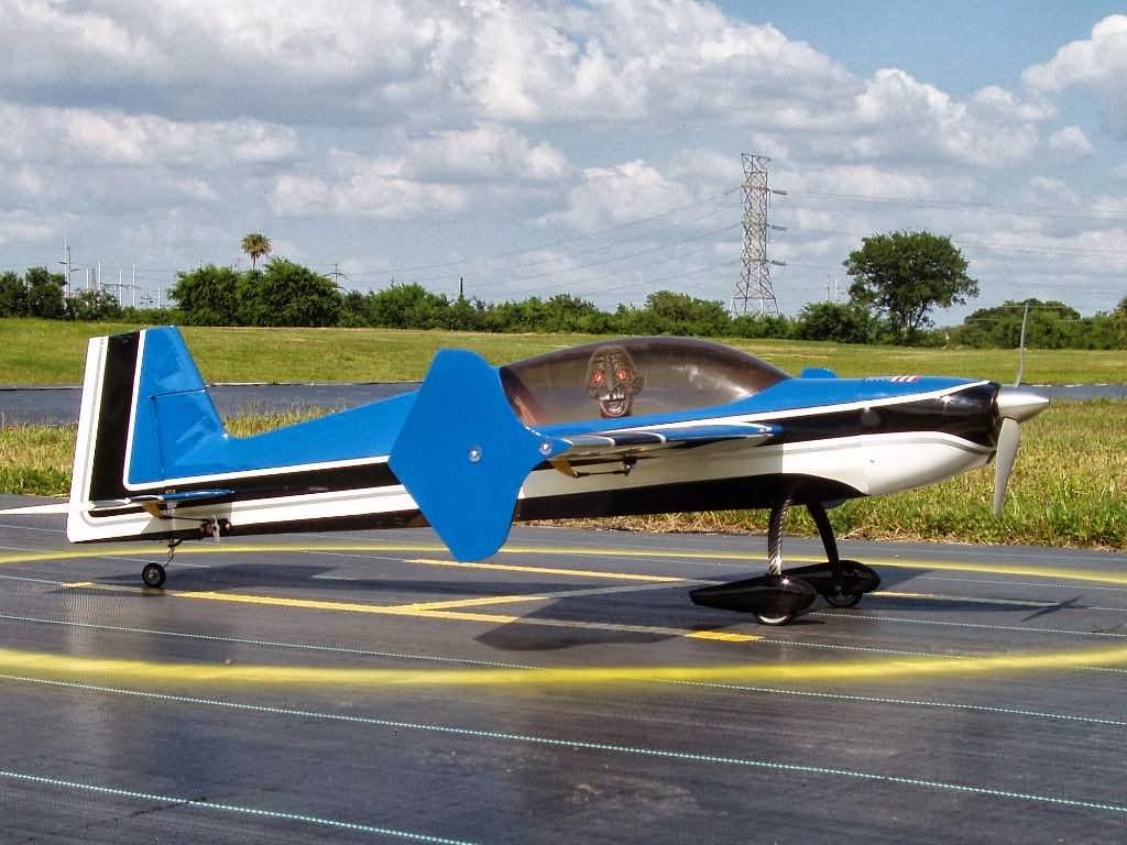 While most of the world thought he was gone, Helmet resurfaced a few years later in Cozumel under the alias of SCGT on-line racing ace "Hunge De LaMoose" (see interview later on this page). Hunge (Helmet) was getting ready to retire from racing (he'de been killed enough), so when I contacted him about flying one of our electric 3D planes, he was quite anxious to work with us again.