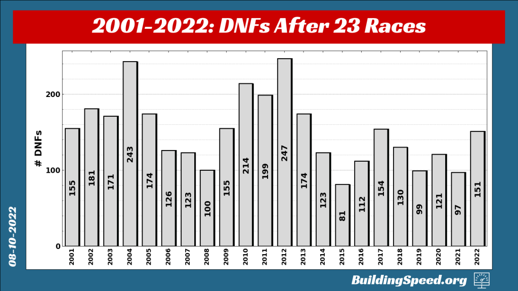 84% of 2022 DNF’s are attributable to crashes and engine failure.