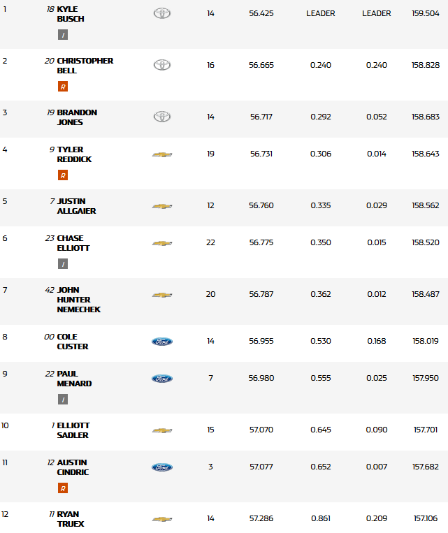 Shane Lee out of his family's small single car team and into a RCR car 3rd fastest in the second practice. Kaz Gralla in a last minute assembled car with part owner Tony Eury Jr. and his father in 12th. Gralla has four races to find a sponsor(s).